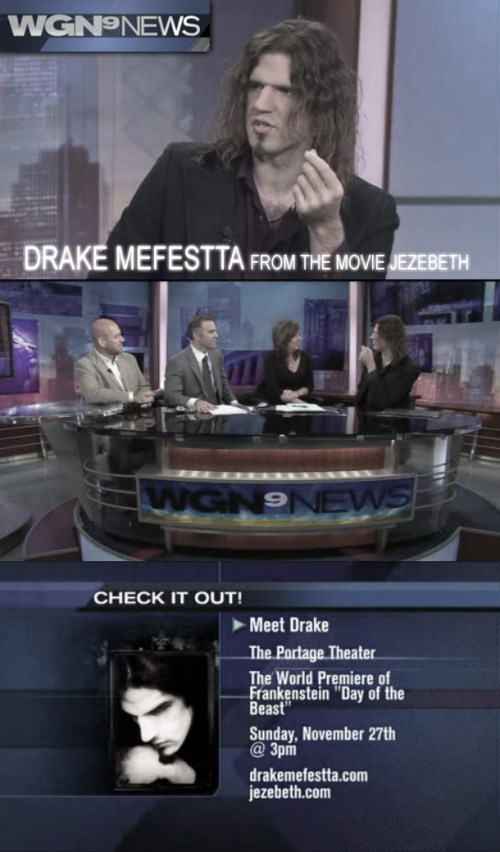 Drake Mefestta who stars in the television show “Jezebeth” as well as the full length vampire horror film “Jezebeth” intrigued it’s audience with an interview on WGN Television that reached out to more than a million people. Actress Linda Blair who is best known for her role as the possessed child, Regan, in the 1973 film The Exorcist also appeared on the show. Drake had first gained worldwide attention with an appearance that included a Live Feeding on the “History Channel” in Canada. The interview on WGN Television aired live on the Morning News Show, Channel 9 Chicago on Friday October 28th 2011. Drake Mefestta has decided to come out of the dark with his condition known as “vampirism” and pursue his career in acting and music. To watch the WGN Television interview with Drake just click on the link below: